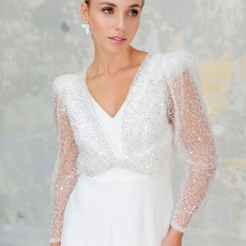 Chaqueta de novia para fiesta realizada en tull paillette y cristal. Se puede anudar en delantero y espalda. Chaqueta reversible